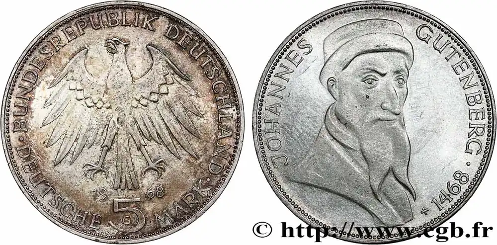 Certifié ALLEMAGNE 5 Mark Johannes Gutenberg 1968 Karlsruhe fwo_784200 Monde