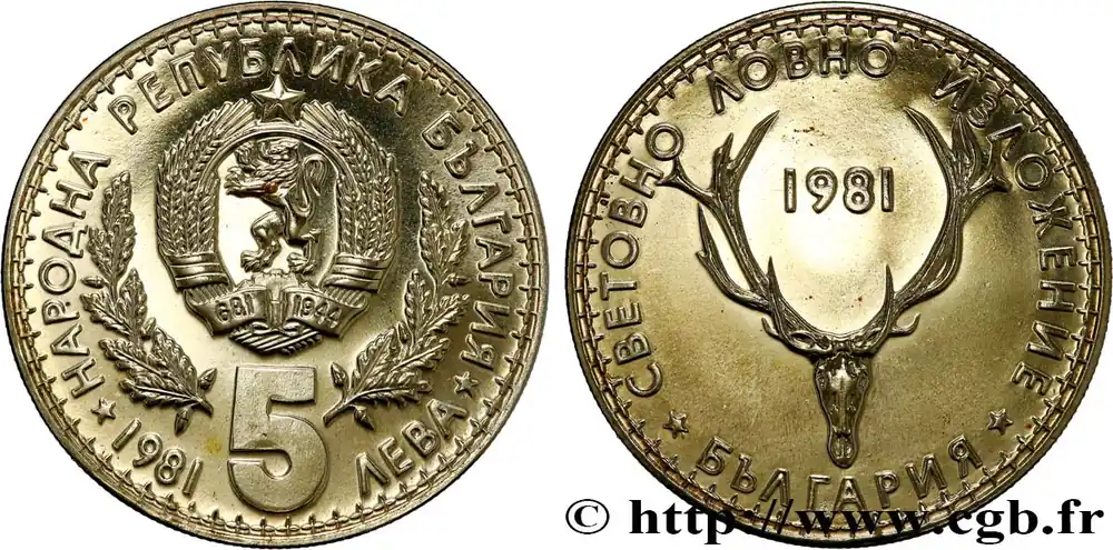Paiement Sécurisé BULGARIE 5 Leva exposition internationale de la chasse, emblème national / tête de cerf 1981 Sofia fwo_732109 Monde