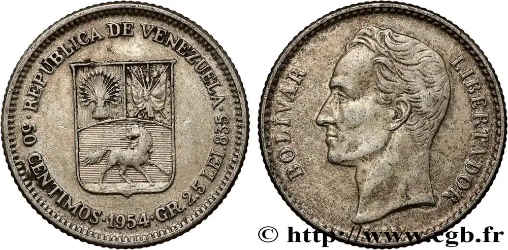 VENEZUELA 50 Centimos emblème / Simon Bolivar 1954 Philadelphie fwo_807742 Monde Solde