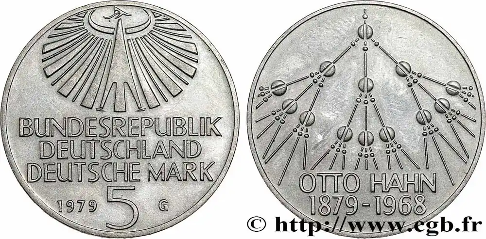 Meilleure Vente ALLEMAGNE 5 Mark aigle héraldique / hommage au chimiste Otto Hahn, fragmentation nucléaire 1979 Karlsruhe – G fwo_784352 Monde