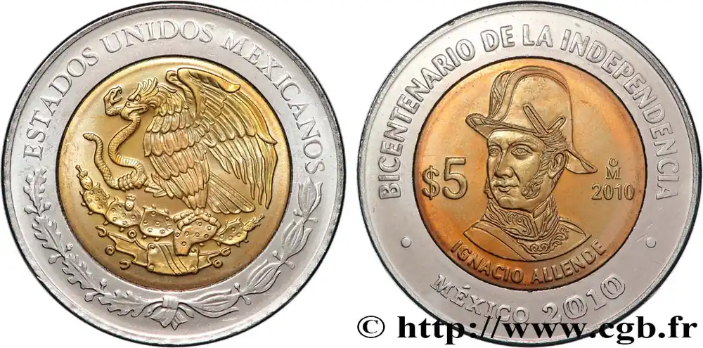 Bon Marché MEXIQUE 5 Pesos Bicentenaire de l’Indépendance : aigle / Ignacio Allende 2010 Mexico fwo_839642 Monde