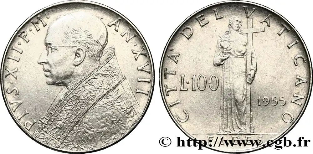 VATICAN ET ÉTATS PONTIFICAUX 100 Lire Pie XII an XVII / Fides tenant la croix 1955 Rome fwo_821480 Monde Quantité Limitée