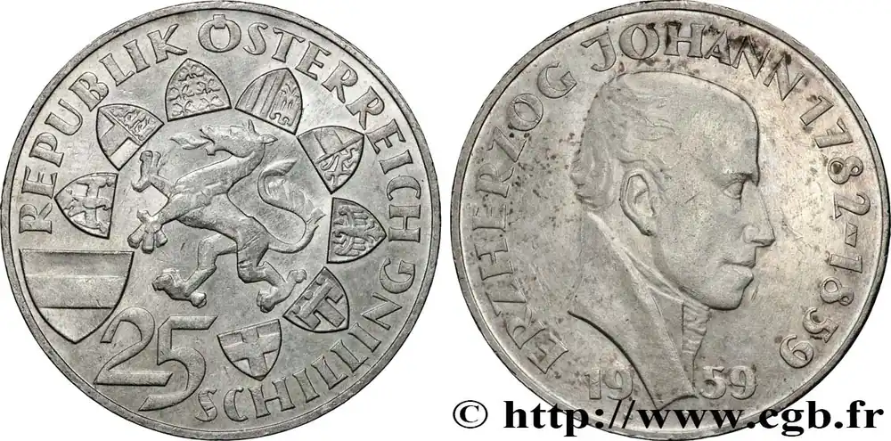 AUTRICHE 25 Schilling 100e anniversaire de la mort de l’archiduc Jean-Baptiste d’Autriche 1959 fwo_838957 Monde Meilleur Prix