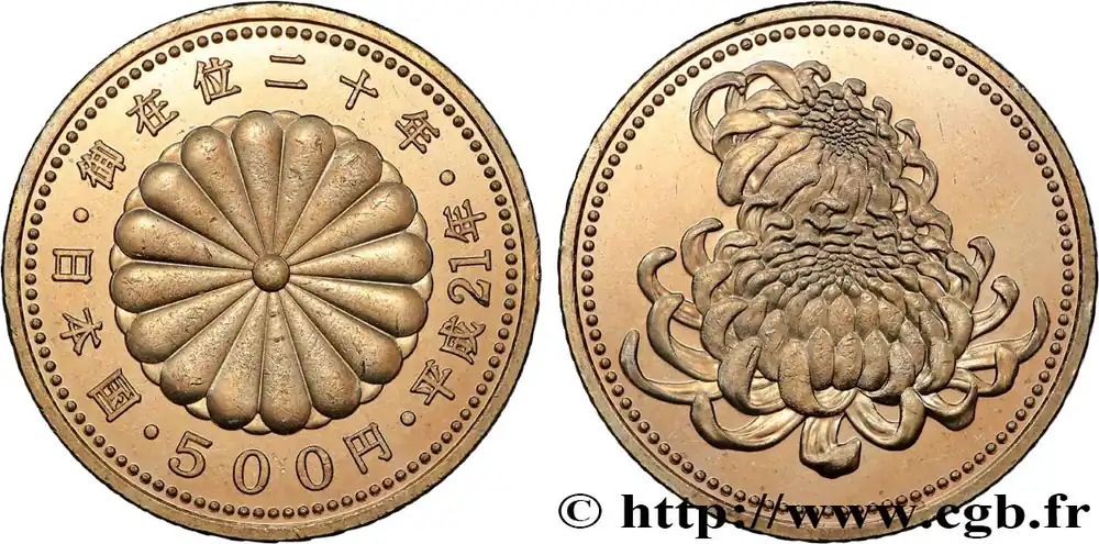 Livraison Mondiale JAPON 500 Yen 20e anniversaire de règne de l’empereur Akihito / chrysanthèmes an 21 ère Heisei 2009 fwo_824641 Monde