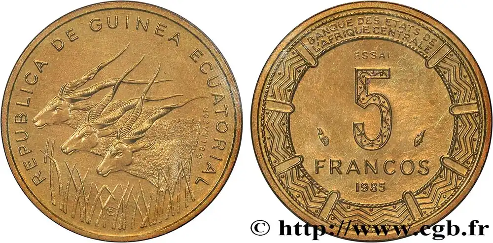 Retour Gratuit GUINÉE ÉQUATORIALE Essai de 5 Francos BEAC antilopes 1985 Paris fwo_851782 Monde