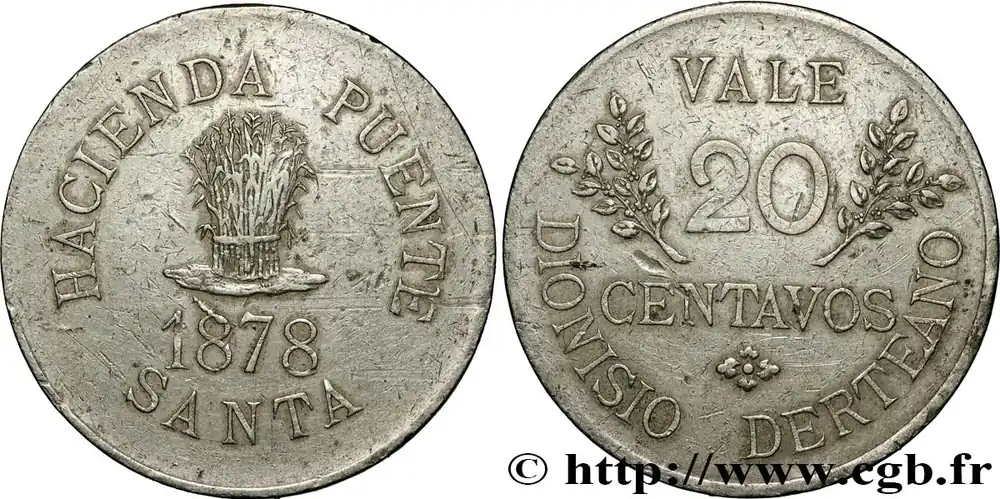 Artisanat PÉROU 20 Centavos Hacienda Puente de Dionisio Derteano 1878 fwo_852066 Monde