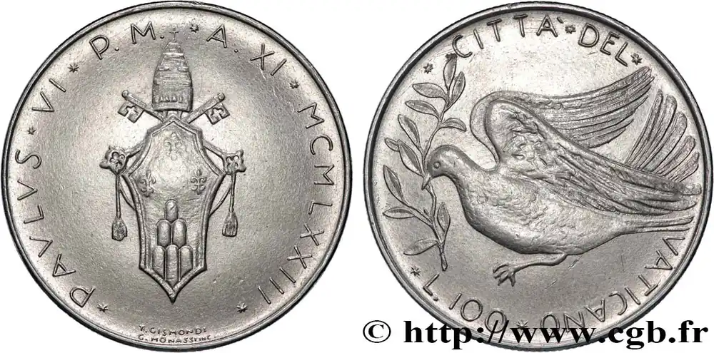 VATICAN ET ÉTATS PONTIFICAUX 100 Lire armes / colombe de la paix an XI du pontificat de Paul VI 1973 Rome fwo_821476 Monde Prix Choc
