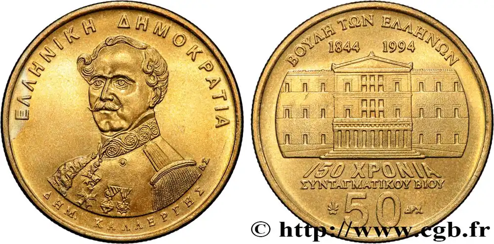 Populaire GRÈCE 50 Drachmes 150e anniversaire de la Constitution de 1944 : Dimitrios Kallergis / parlement 1994 fwo_837788 Monde