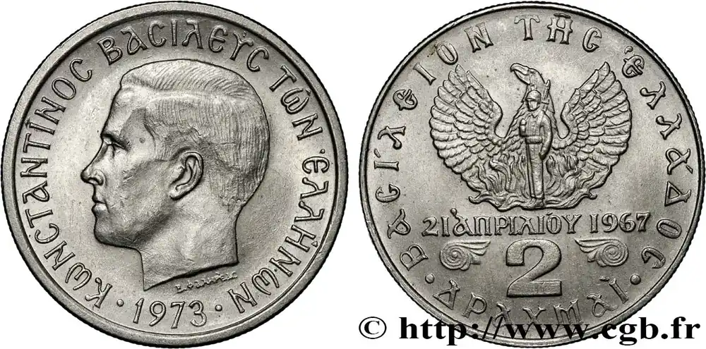 GRÈCE 2 Drachmes Constantin II / Phénix et soldat 1973 fwo_809852 Monde Expédié Aujourd’hui