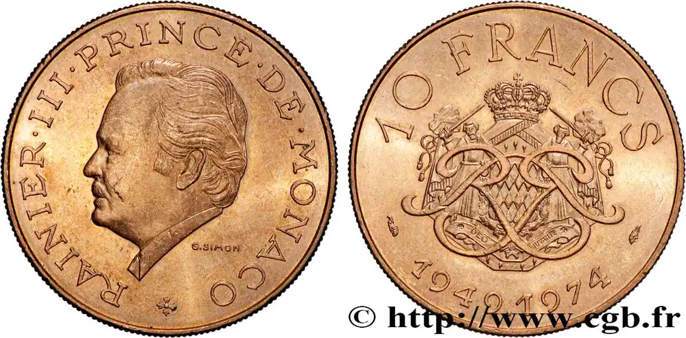 MONACO 10 Francs 25e anniversaire du règne de Rainier III 1974 Paris fwo_870406 Monde Offre Du Jour
