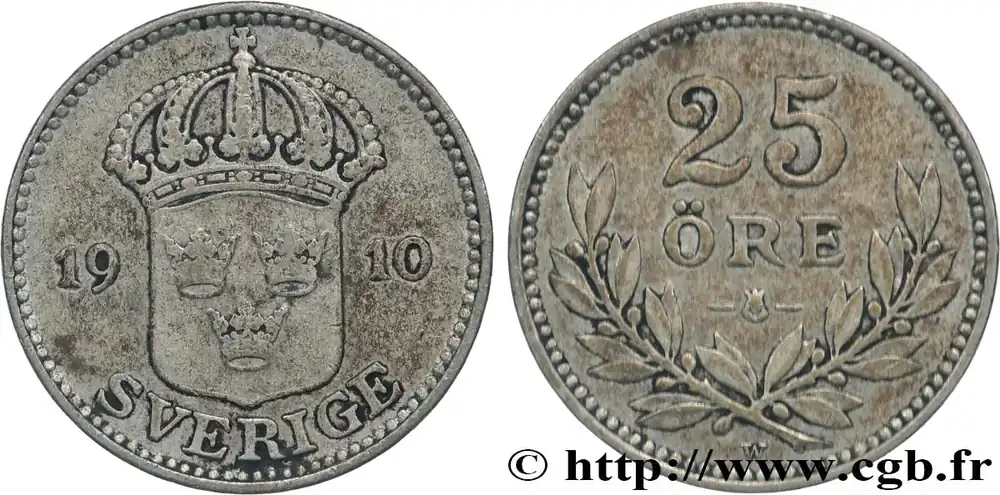 SUÈDE 25 Ore écu couronné variété à large croix 1910 fwo_854247 Monde Nouveauté