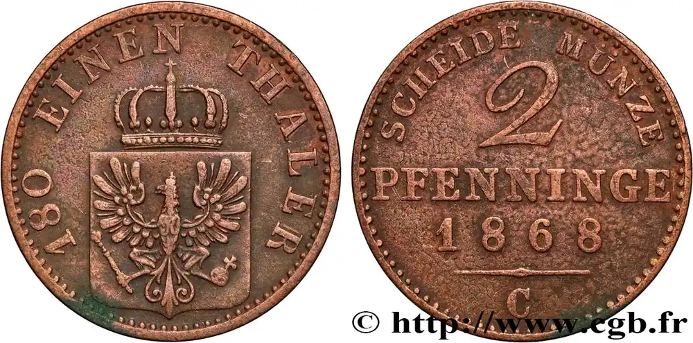 Certifié ALLEMAGNE – PRUSSE 2 Pfenninge Royaume de Prusse 1868 Francfort – C fwo_855794 Monde