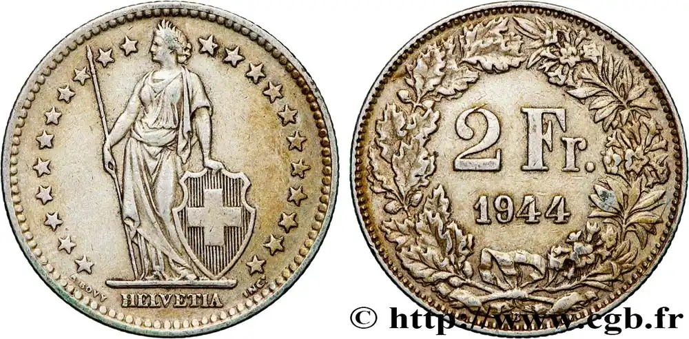 SUISSE 2 Francs Helvetia 1944 Berne fwo_878140 Monde Premium