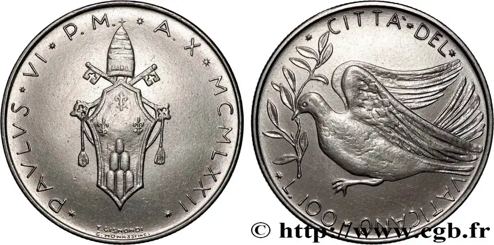 VATICAN ET ÉTATS PONTIFICAUX 100 Lire armes / colombe de la paix an X du pontificat de Paul VI 1972 Rome fwo_824740 Monde Expédié Aujourd’hui