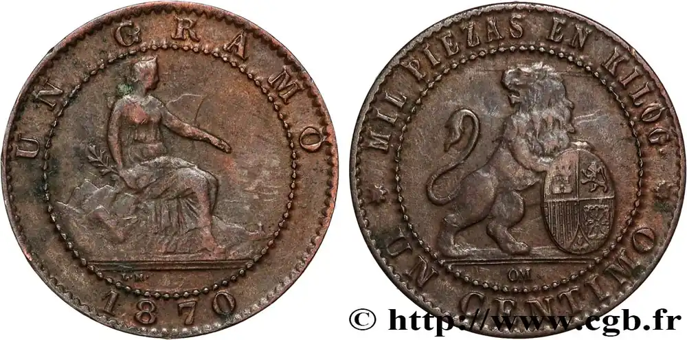 ESPAGNE 1 Centimo monnayage provisoire “ESPAÑA” assise / lion au bouclier 1870 Oeschger Mesdach & CO fwo_894881 Monde Offre Limitée