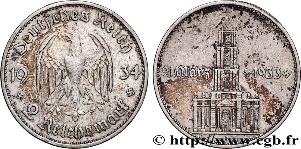 ALLEMAGNE 2 Reichsmark Commémoration du serment du 21 mars 1933 en l’église de la garnison de Potsdam 1934 Berlin fwo_901309 Monde Top Vente