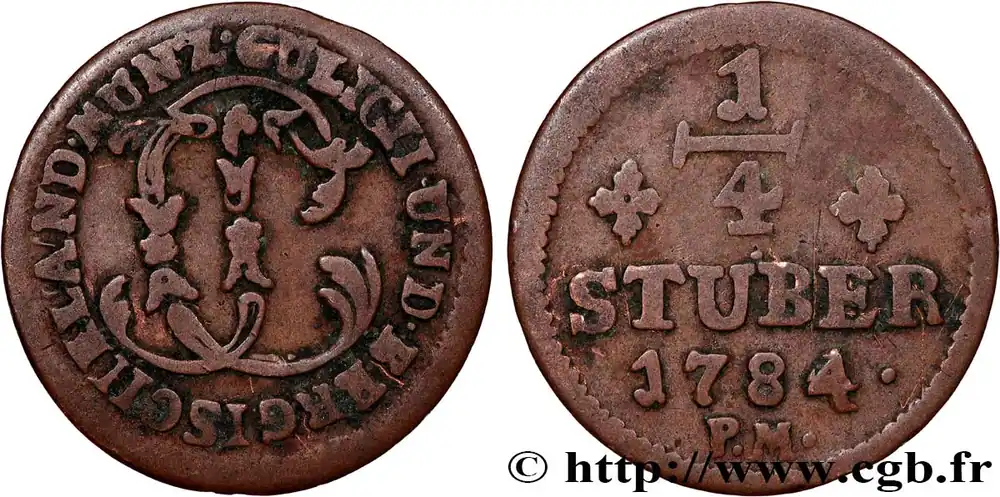 ALLEMAGNE – JULIERS-BERG 1/4 Stuber Duché de Jülich-Berg monogramme de Carl Théodore de Bavière 1784 Düsseldorf fwo_901369 Monde Offre Limitée