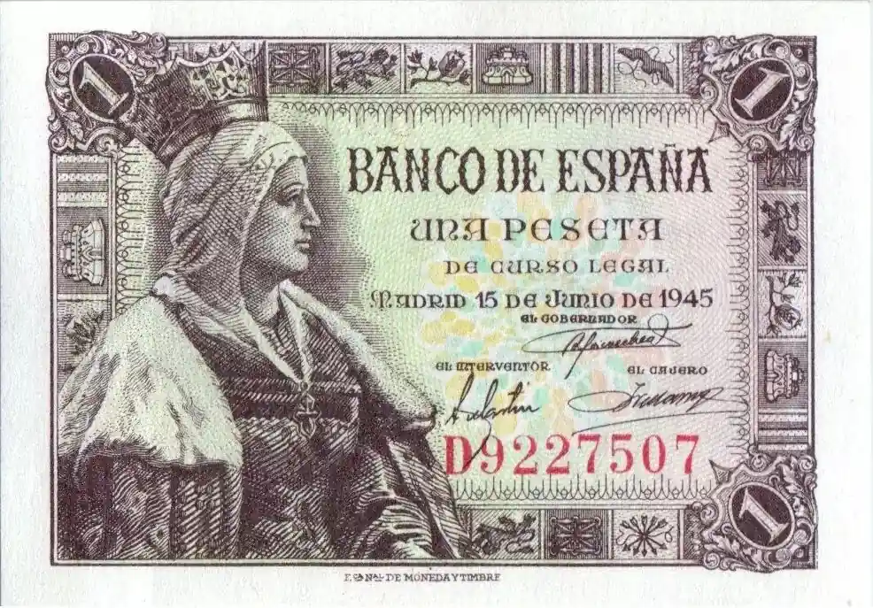 Billet Espagne 1 Peseta Isabelle la Catholique – 1945 Expédié Aujourd’hui