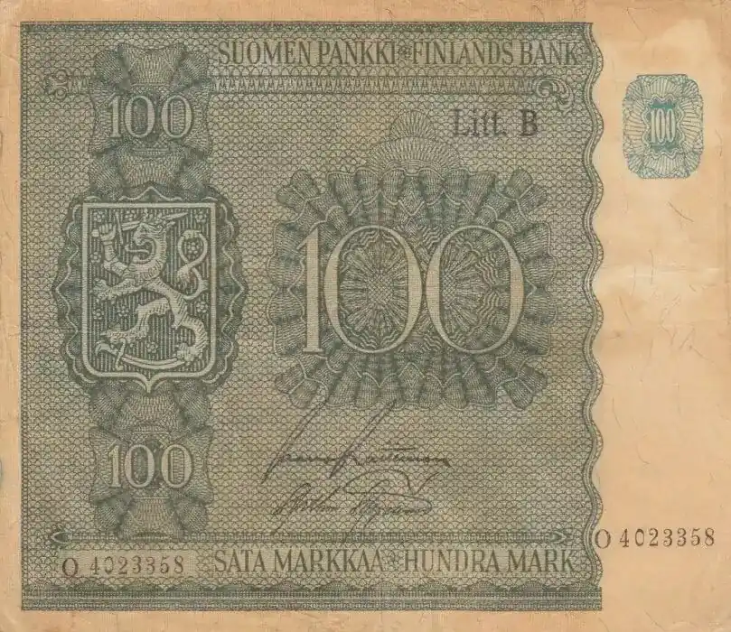 Billet Finlande 100 Markkaa – Bleu & vert – Litt B – 1945 (1948) – P.88 Authentique