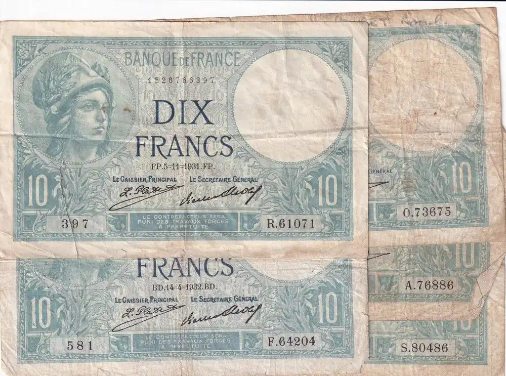 Super Prix Billet France Lot de 5x 10 Francs – Minerve – de 1931 à 1940 – B à TB