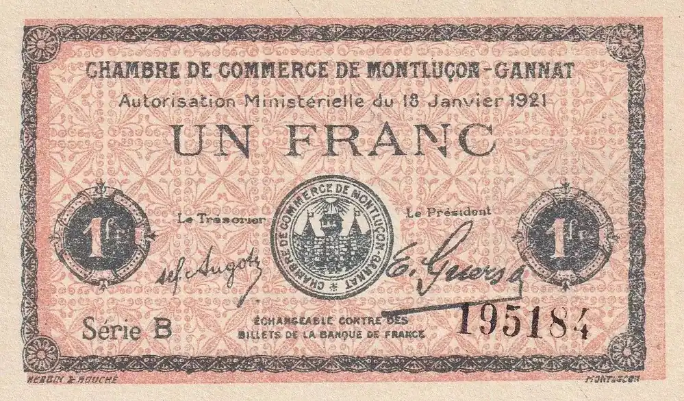 Top Vente Billet France 1 Franc – Chambre de commerce de Montluçon-Gannat – Série B – P.84-58