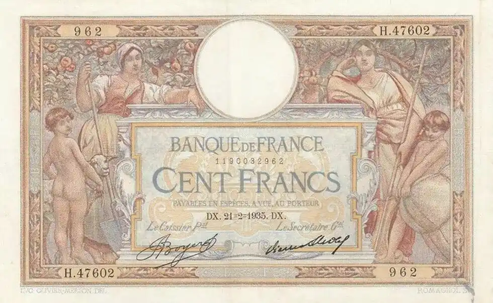Top Vente Billet France 100 Francs Luc Olivier Merson – Grands Cartouches – 1935
