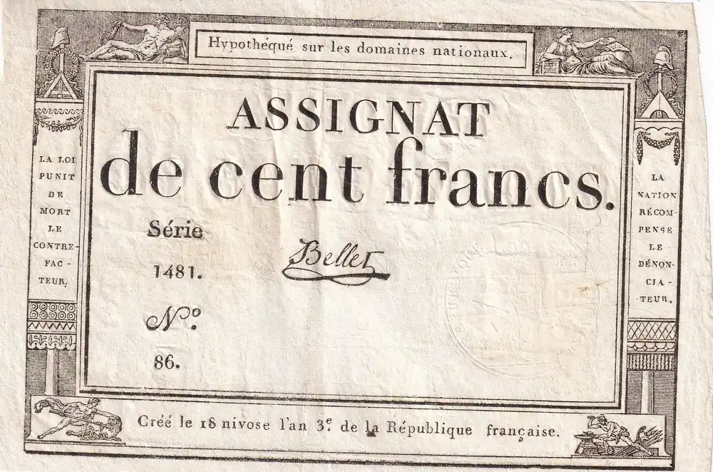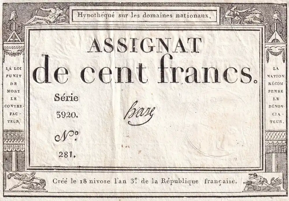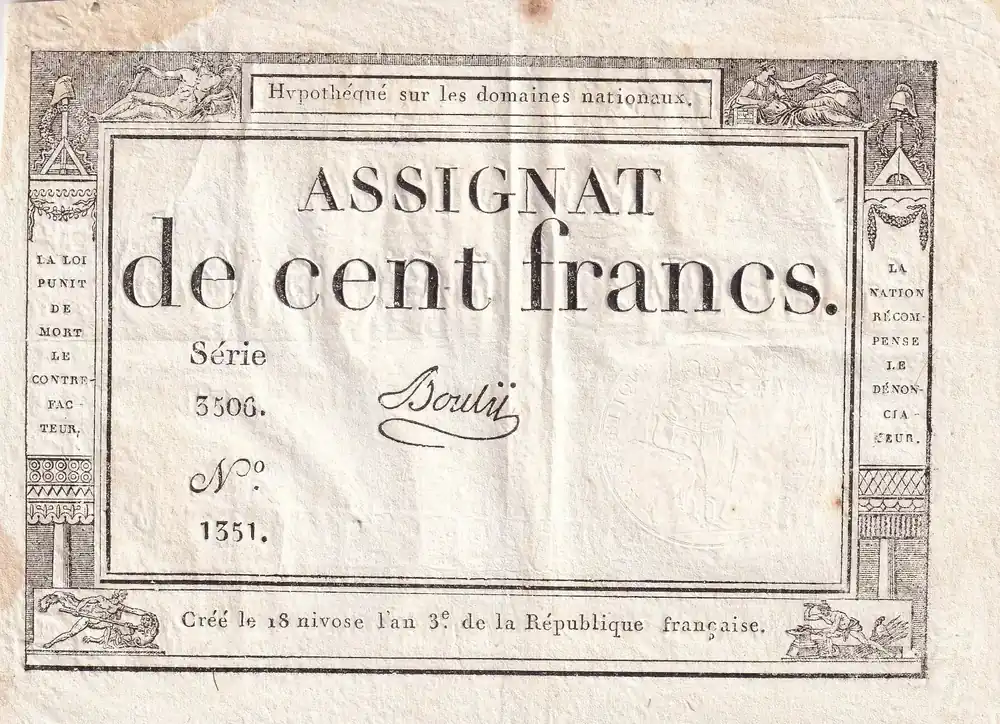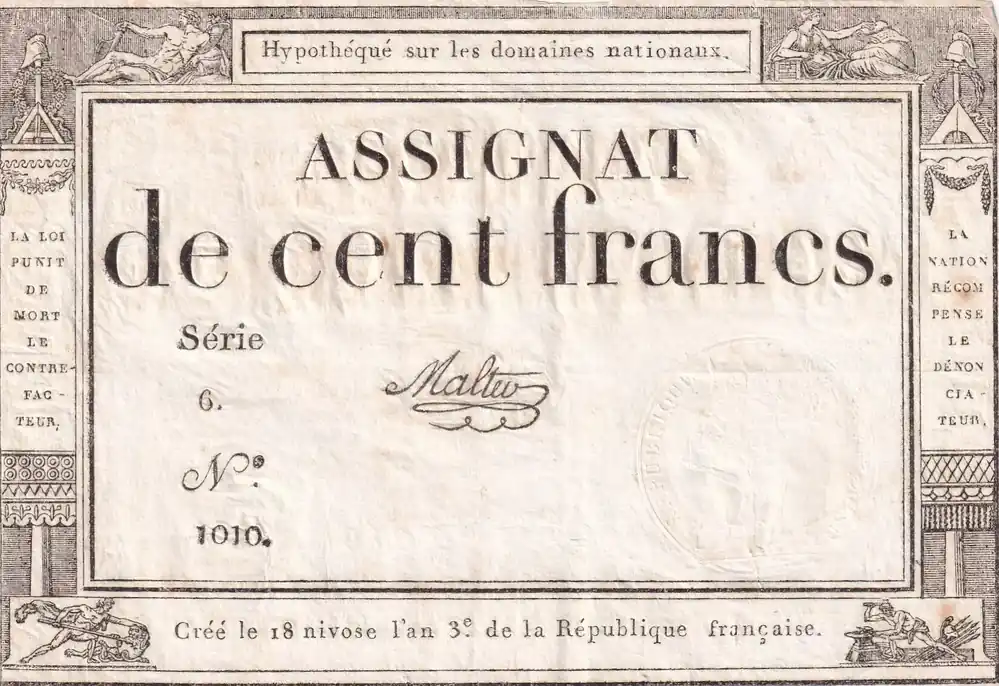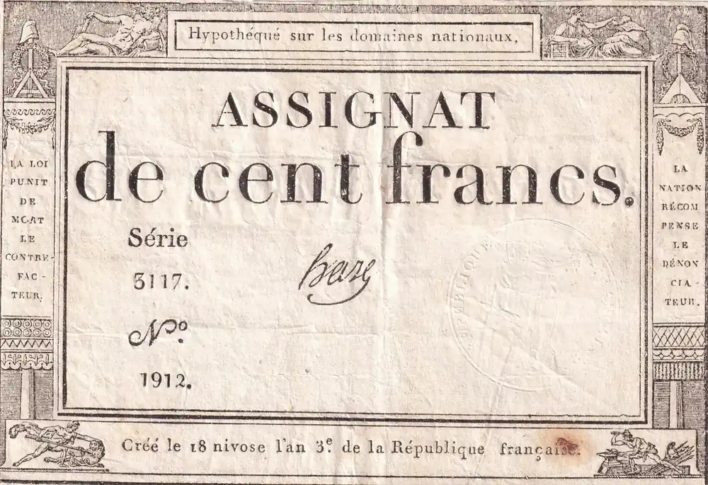 Billet France 100 Francs – 18 Nivose An III – (07.01.1795) – Sign. Haze – Série 3117 – L.173 Original
