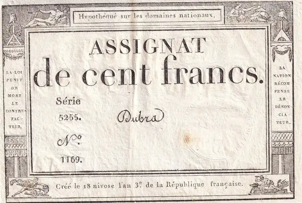 Billet France 100 Francs – 18 Nivose An III – (07.01.1795) – Sign. Dubra – Série 5255 – L.173 Réduction