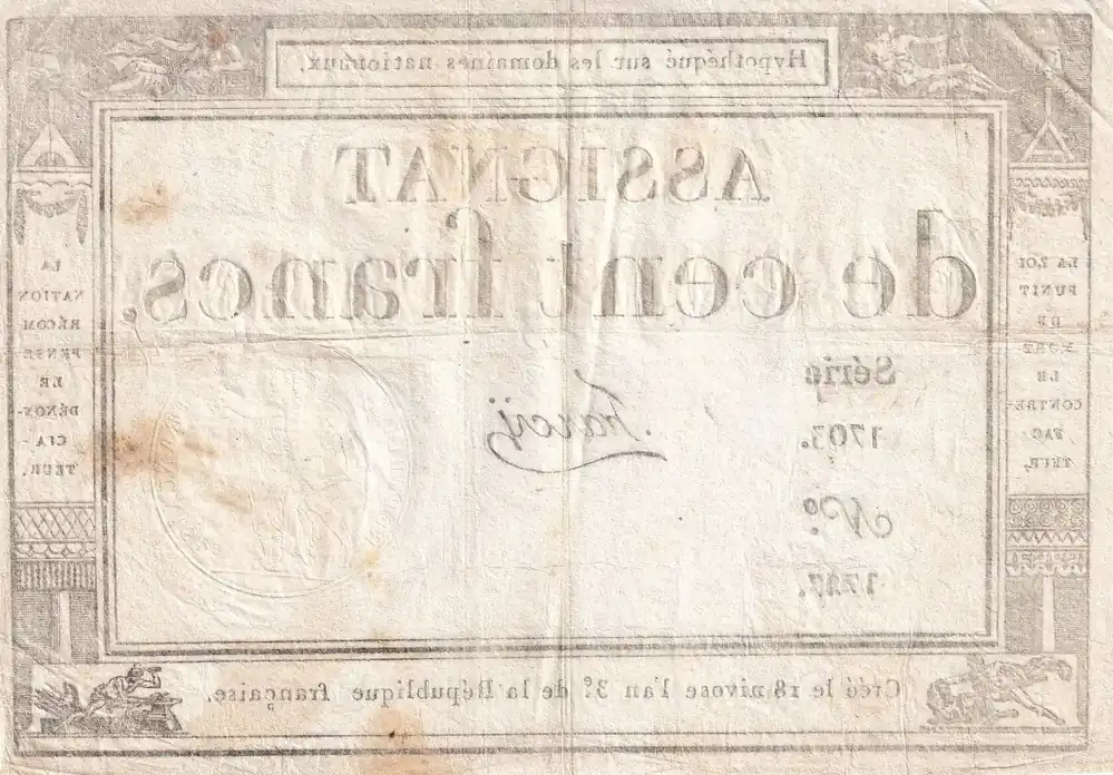 Billet France 100 Francs – 18 Nivose An III – (07.01.1795) – Sign. Edouard – Série 722 – L.173 Marque