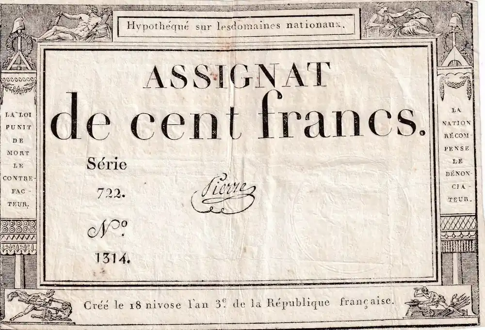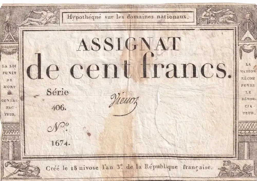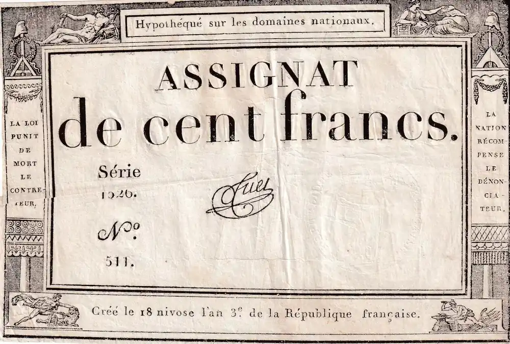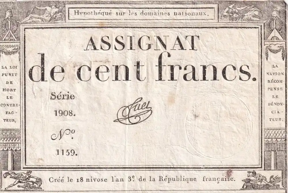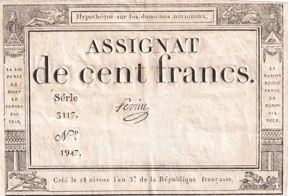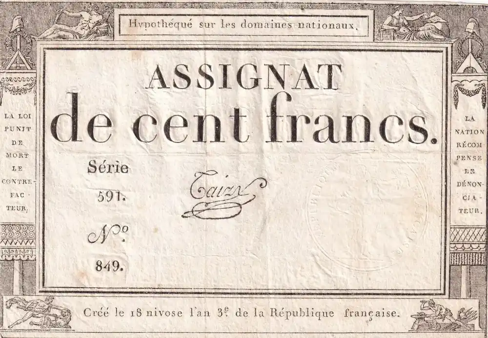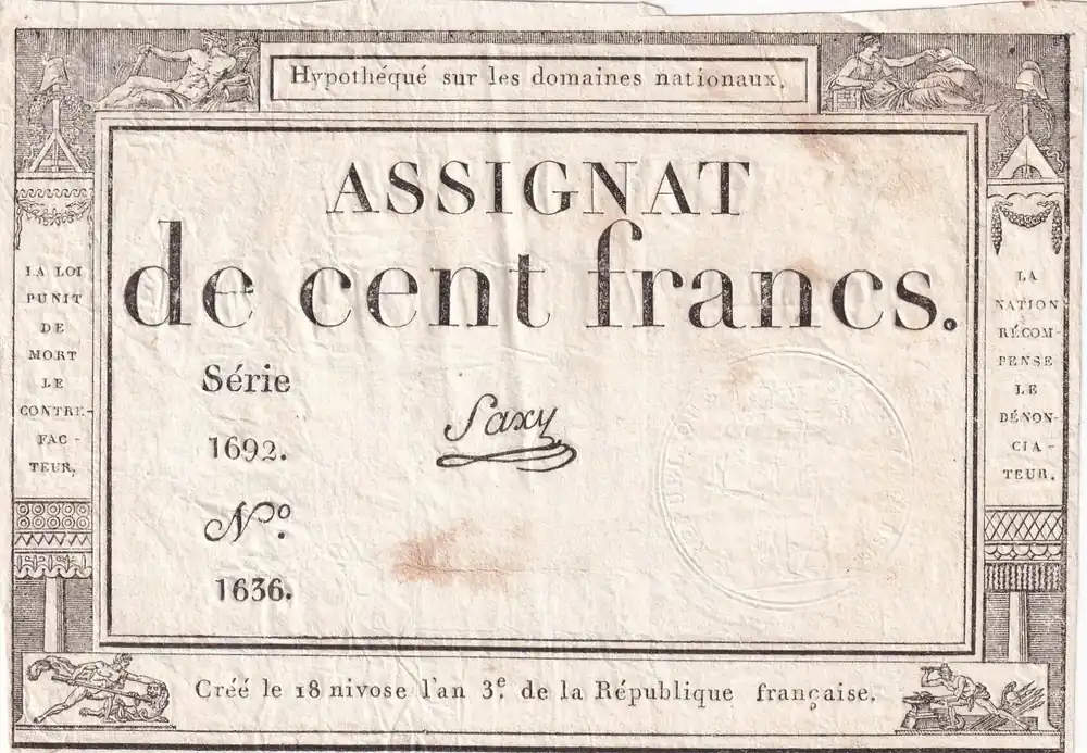 Billet France 100 Francs – 18 Nivose An III – (07.01.1795) – Sign. Saxy – Série 1573 – L.173 Authentique