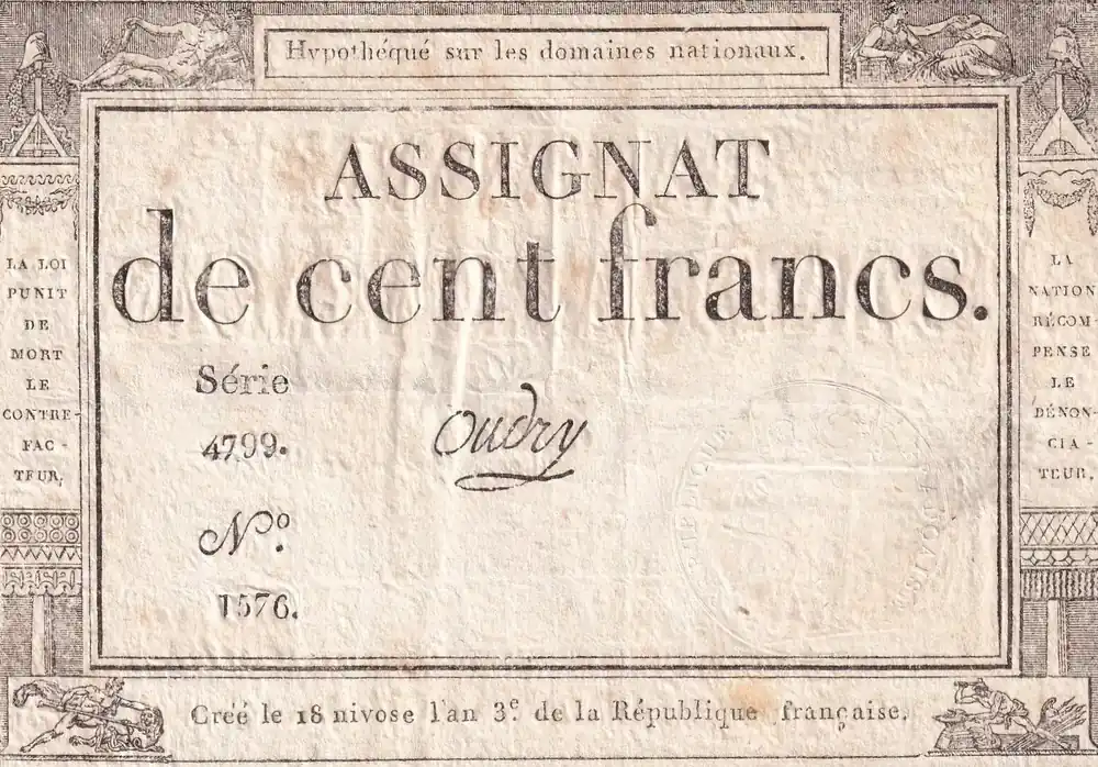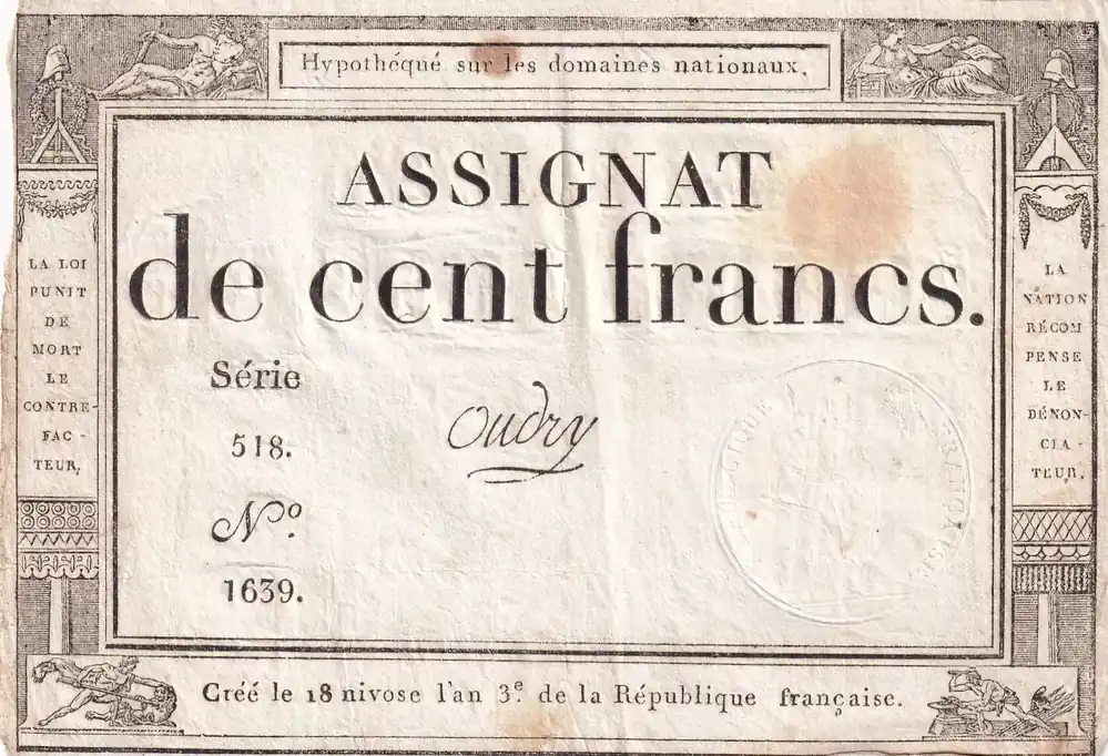 Billet France 100 Francs – 18 Nivose An III – (07.01.1795) – Sign. Oudry – Série 518 – L.173 Authentique