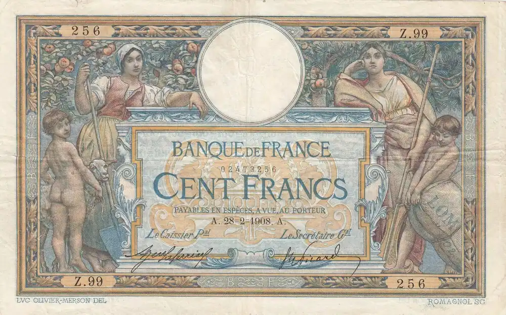 Billet France 100 Francs Luc Olivier Merson – avec LOM 28-02-1908 – Série Z.99 Gros Lot