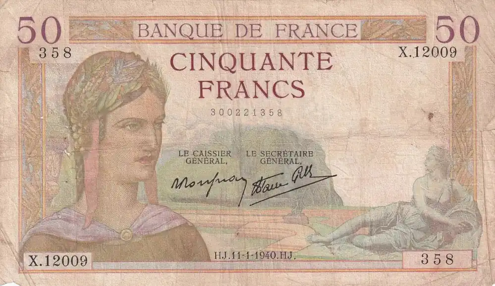 Commander Maintenant Billet France 50 Francs Cérès -11-01-1940 – Série X.12009 – F.18-37