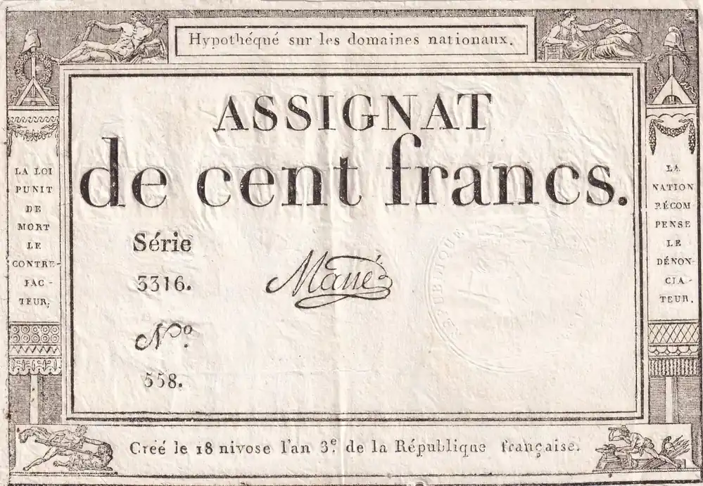 Dernier Modèle Billet France 100 Francs – 18 Nivose An III – (07.01.1795) – Sign. Mané – Série 3316 – L.173