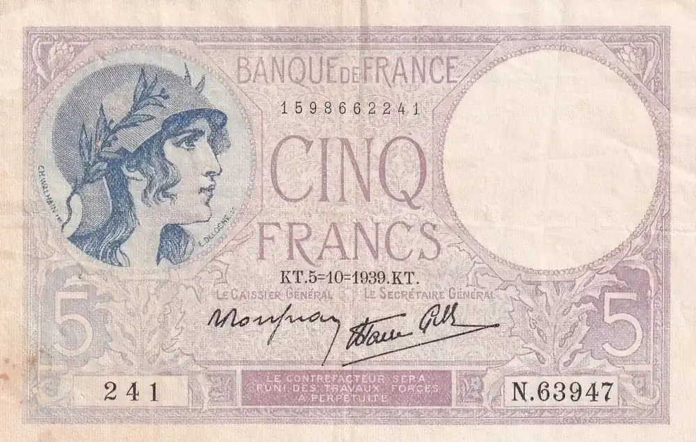 Commander Vite Billet France 5 Francs – Violet – 05-10-1939 – Série N.63947 – F.04.11