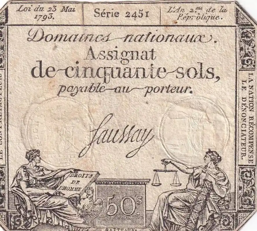 Dernier Modèle Billet France 50 Sols – Liberté et Justice (23-05-1793) – Sign. Saussay – Série 2451 – L.167.1
