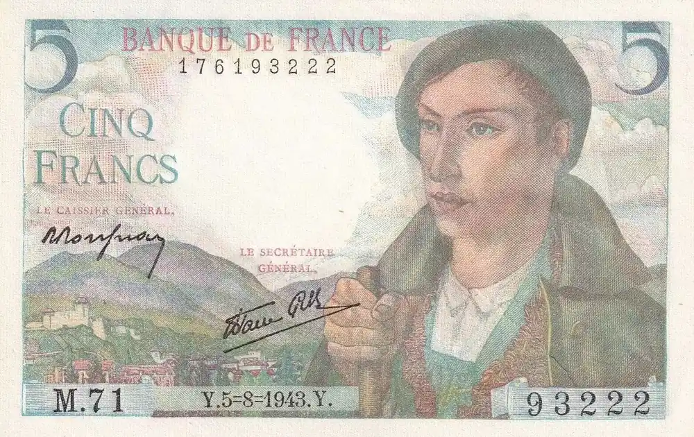 Commander Vite Billet France 5 Francs Berger – 05-08-1943 – Série M.71 – F.05.03