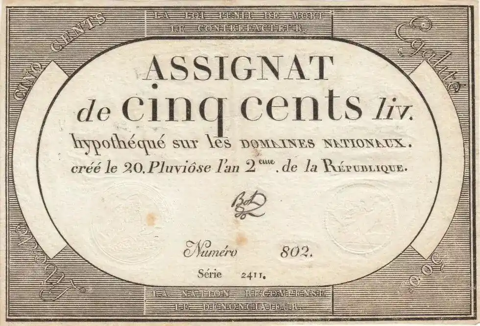Dernier Modèle Billet France 500 Livres 20 Pluviose An II – 8.2.1794 – Sign. Bot