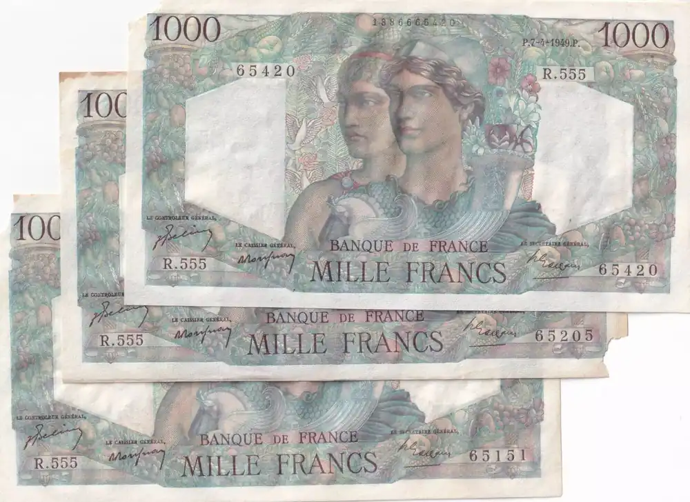 Expédition Rapide Billet France 3 X 1000 Francs – Minerve et Hercule – 07-04-1949 – Série R.555 – F.41.26