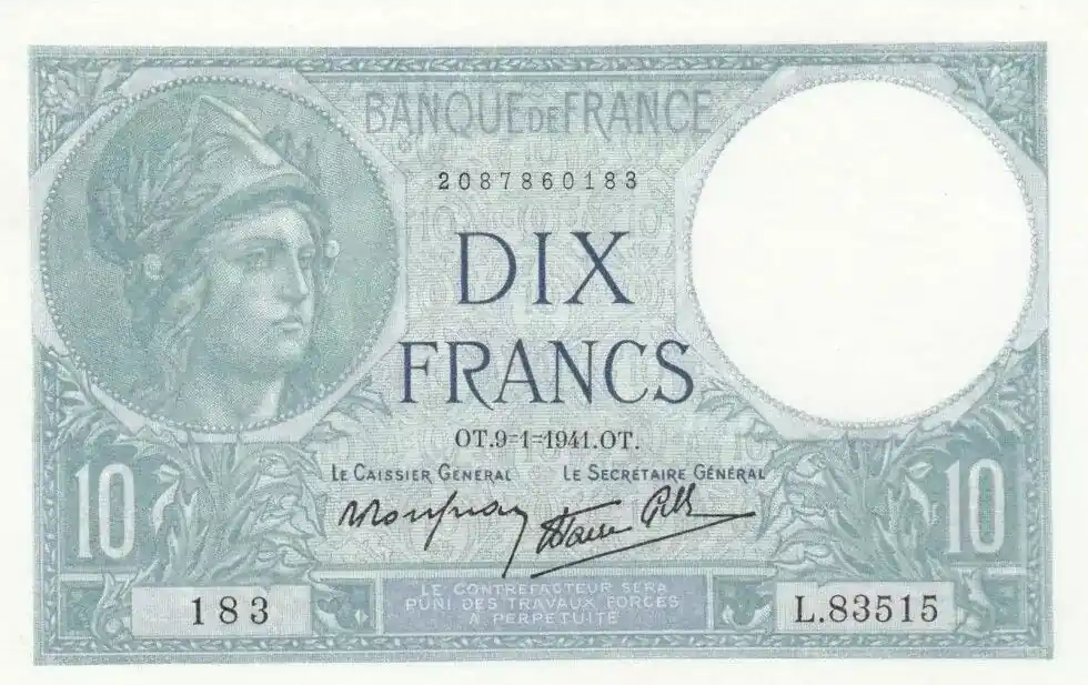 Livraison Mondiale Billet France 10 Francs Minerve – 1941