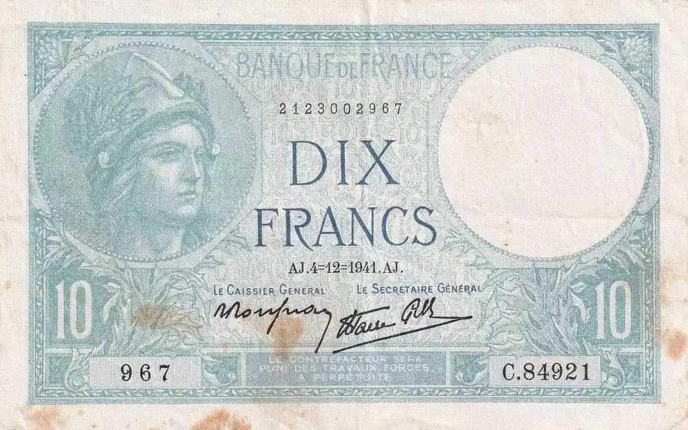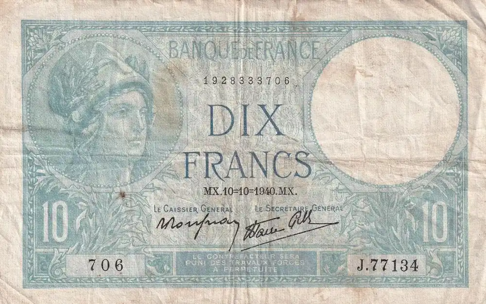 Billet France 10 Francs – Minerve – 10-10-1940 – Série J.77134 – F.07.16 Promotion Saisonnière