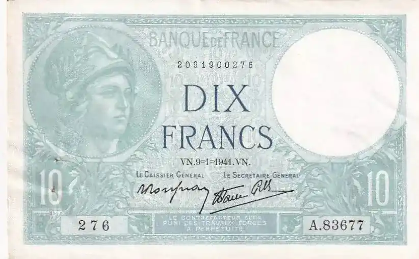 Billet France 10 Francs – Minerve – 09-01-1941 – Série A.83677 – F.07.27 Solde