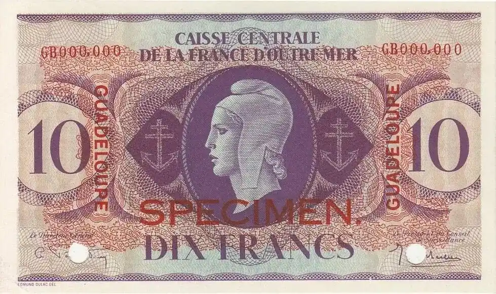 Billet Guadeloupe 10 Francs Marianne – Croix de Lorraine – 1944 Spécimen Commander Vite