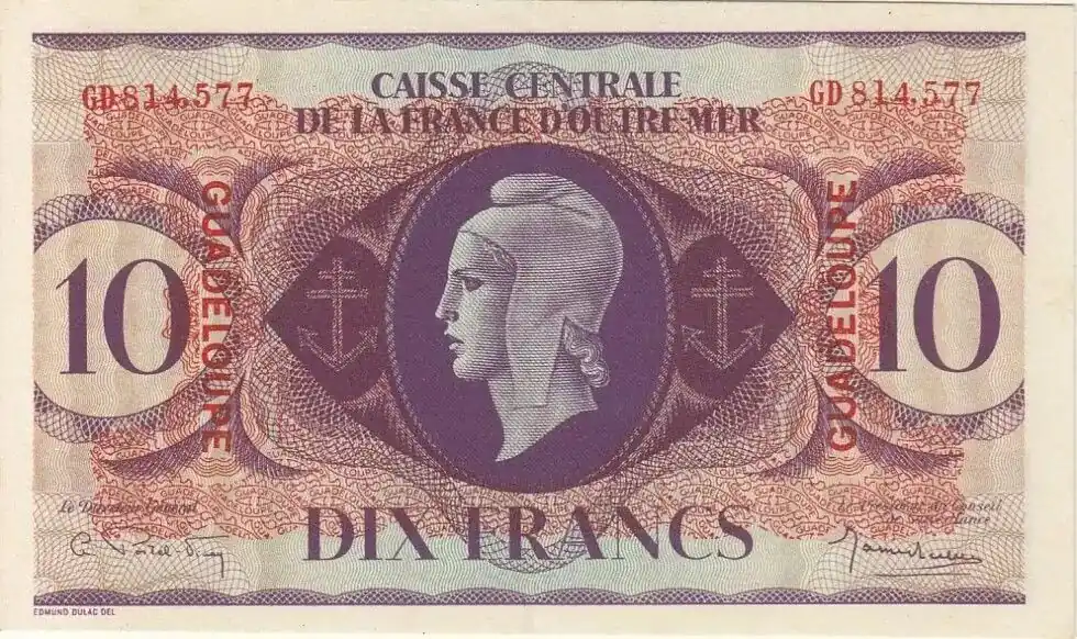 Billet Guadeloupe 10 Francs Marianne – Croix de Lorraine – 1944 GD 814577 Meilleur Choix