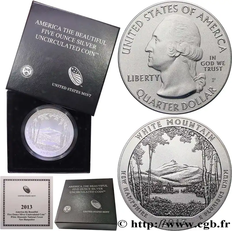Solde ÉTATS-UNIS D’AMÉRIQUE 25 cent – 5 onces d’argent FDC – WHITE MOUNTAIN – New Hampshire 2013 Philadelphie fwo_709702 Monde