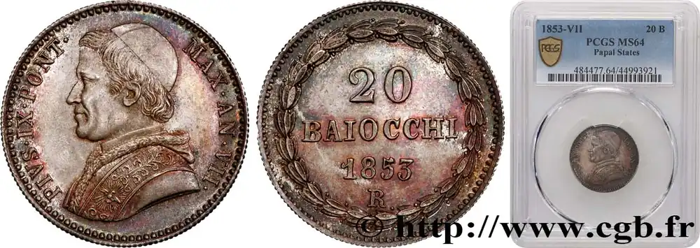 ITALIE – ÉTATS DU PAPE – PIE IX (Jean-Marie Mastai Ferretti) 20 Baiocchi an VII 1853 Rome fwo_718396 Monde Populaire