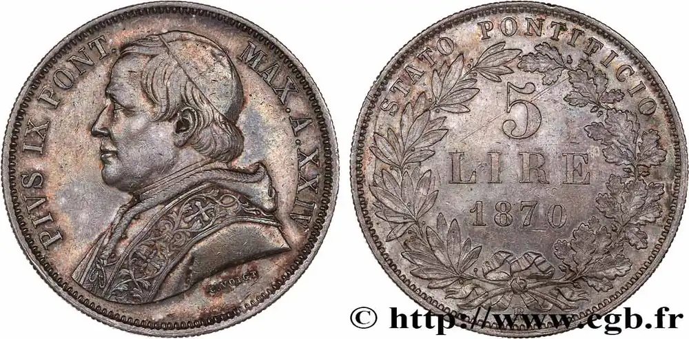 ITALIE – ÉTATS DU PAPE – PIE IX (Jean-Marie Mastai Ferretti) 5 Lire an XXIV 1870 Rome fwo_764700 Monde Pas Cher