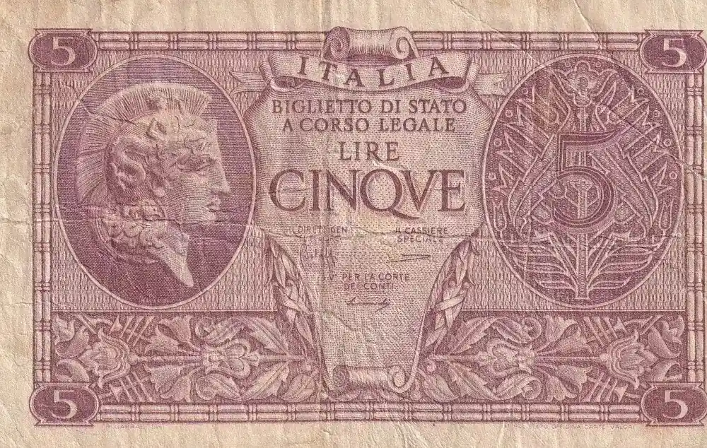 Paiement Sécurisé Billet Italie 5 Lire – Femme casquée – 1944 – P.31c