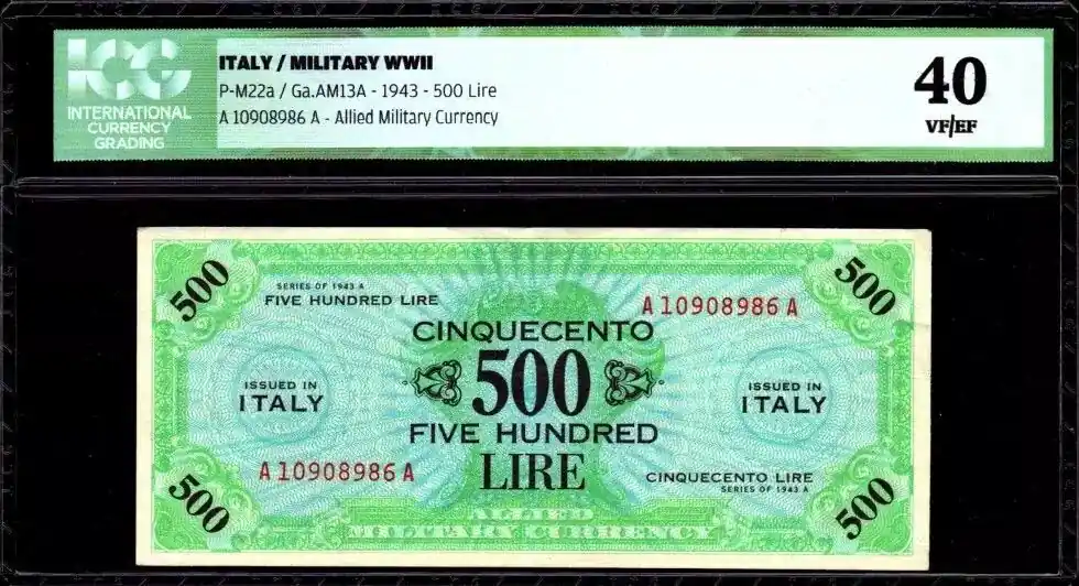 Populaire Billet Italie 500 Lire Vert – 1943 A – ICG VF/EF 40