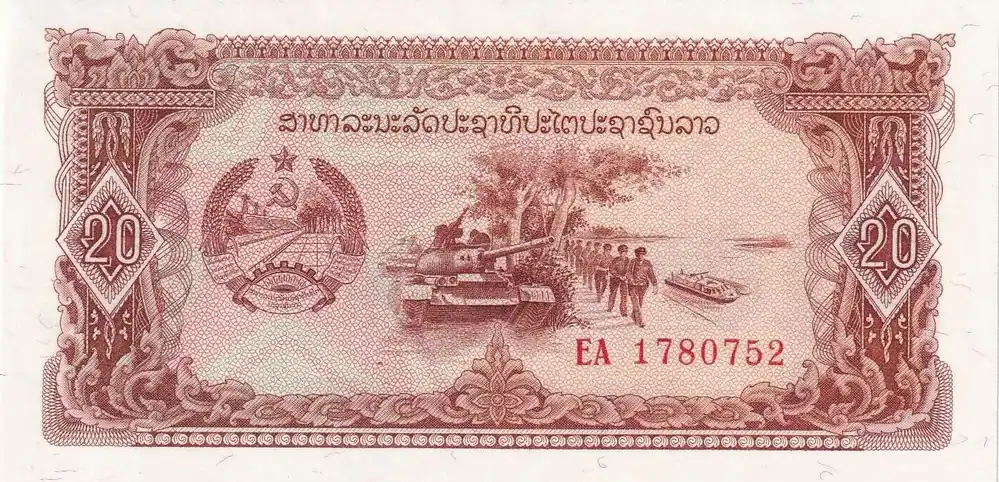Billet Laos 20 Kip – Tank, soldats – Usine textile – 1979 – Série EA – P.28 Populaire